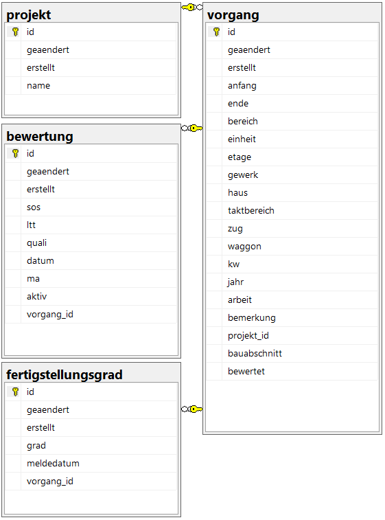 Abbildung 4 zeigt beispielhaft eine Datenbankstruktur, basierend auf den oben beschriebenen Terminplänen. Es wird je Terminplan ein Projekt mit Vorgängen erstellt, die für jeden Tag eine Bewertung und beliebig viele Fertigstellungsgrade für die Nachverfolgbarkeit der erbrachten Leistungen enthalten.