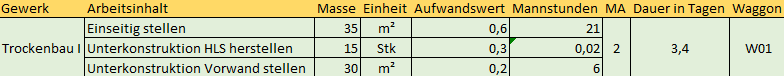 Jede Zeile hat im Idealfall jede für sich wichtige Informationen. In Abbildung 1 steht jede Zeile für eine komplette Fahrt des Ausbauzuges, beschrieben durch die Örtlichkeit (Beispielsweise Wohnungen 1.1.1 – 1.1.3 im 1. OG in Haus 1). Die Beziehung der einzelnen Waggons zum enthaltenen Inhalt ist über die Waggonbezeichnung auf einem anderen Tabellenblatt, auf dem die Gewerkesequenz hinterlegt ist, realisiert (Abbildung 2). Die zuvor beschriebenen Schwierigkeiten liegen auf der Hand. Es reicht ein Tippfehler und die Beziehungen kommen nicht zustande.